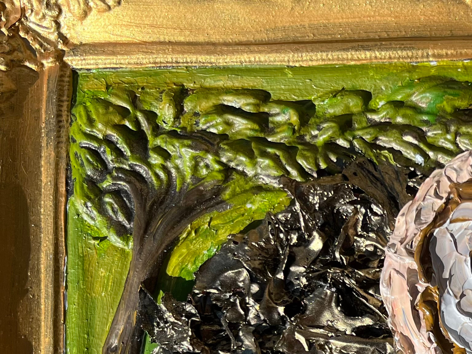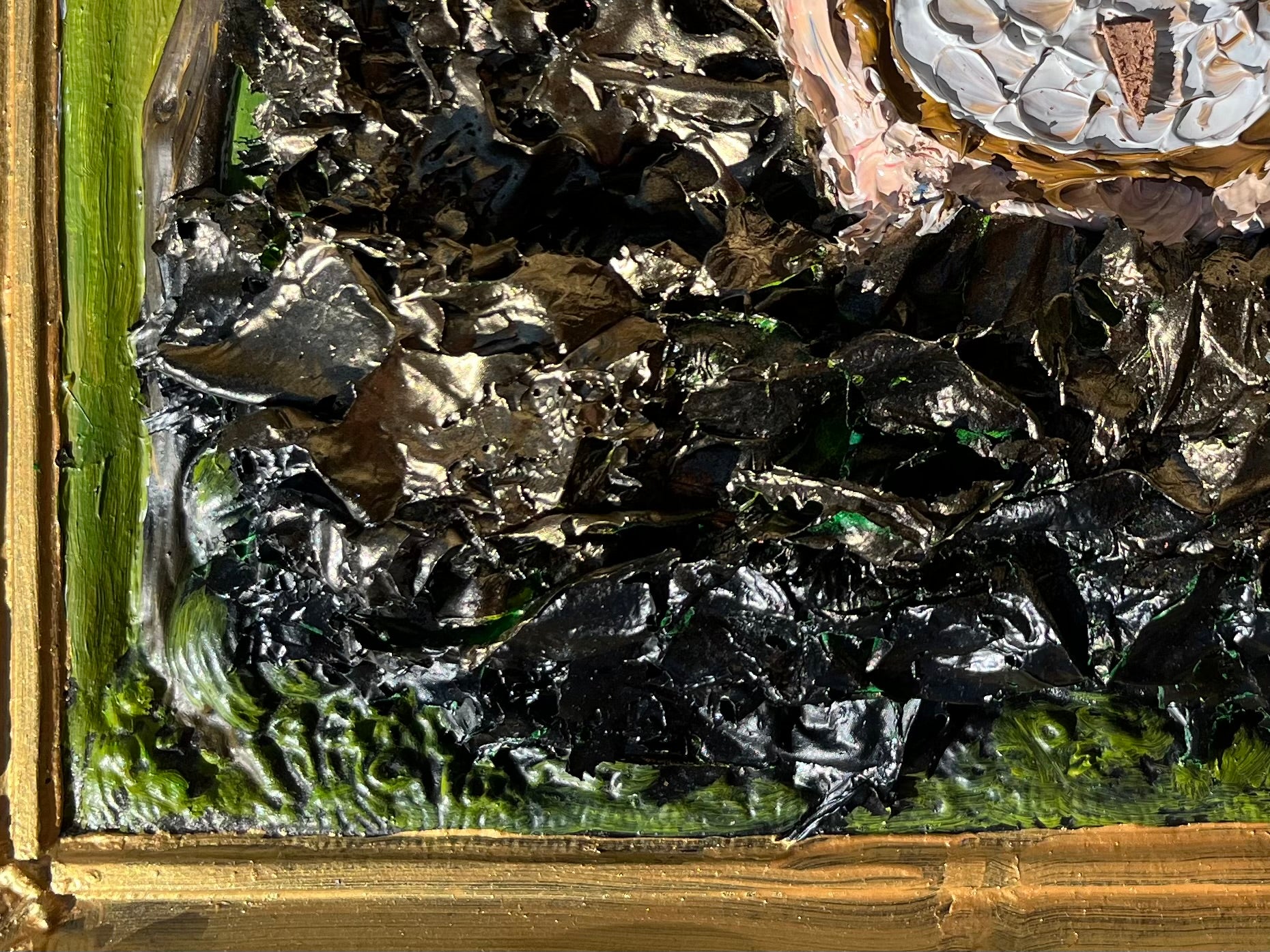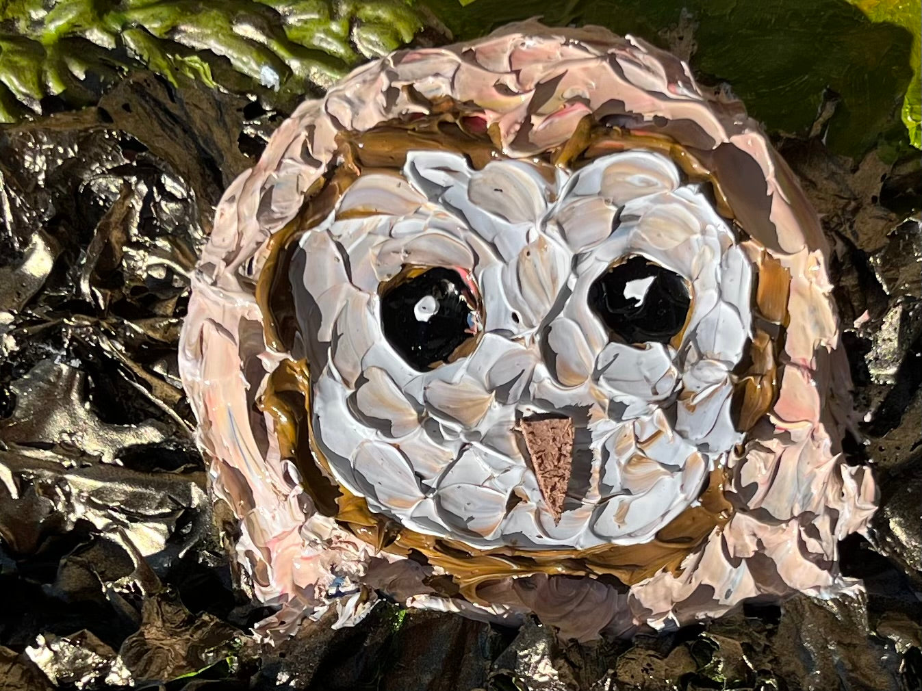 This painting was done on a plaster mass produced religious wall hanging. I added the nest first, because I wanted to do all the extra texture. But it felt sad with only eggs in it so I decided to add the little barn owl baby.