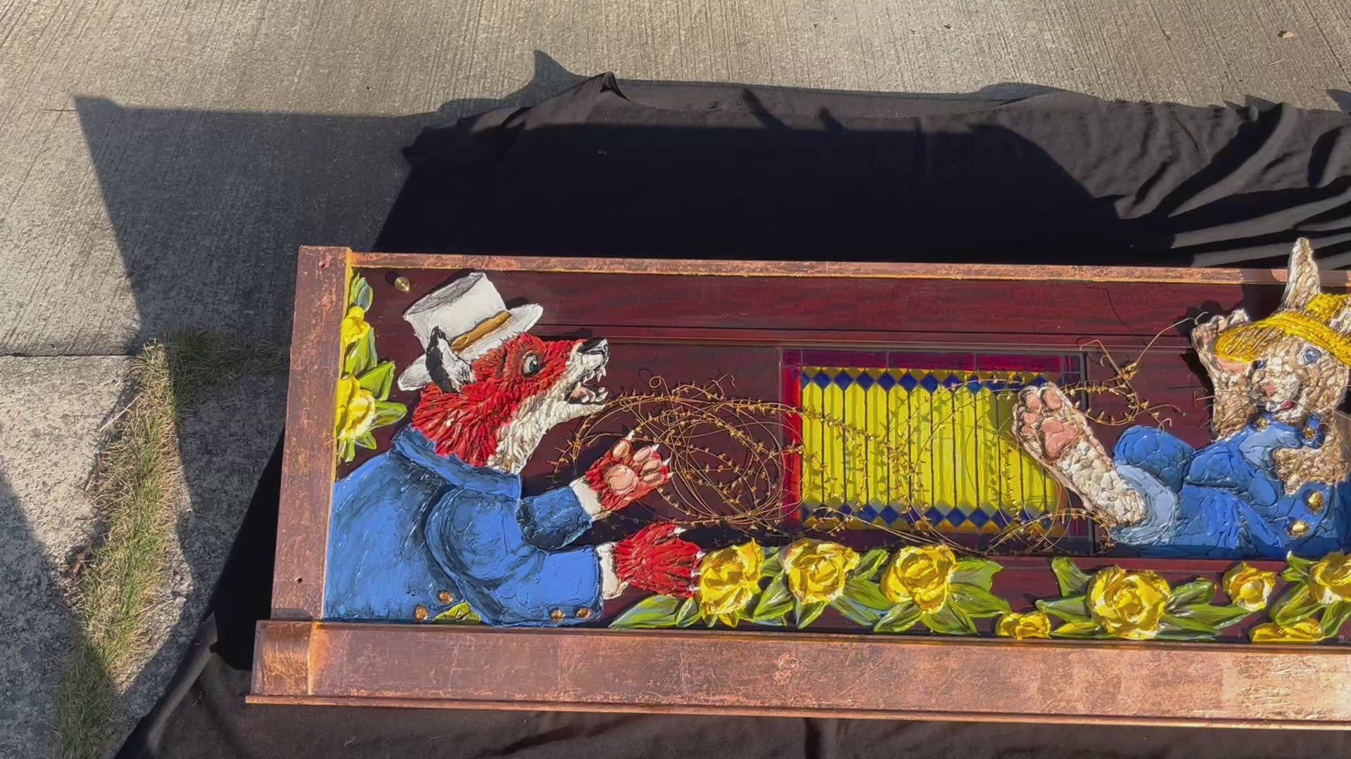 This textured acrylic painting is done on a panel from a disassembled piano. The briars and whiskers are guitar strings. This is a show stopper piece with a great message.