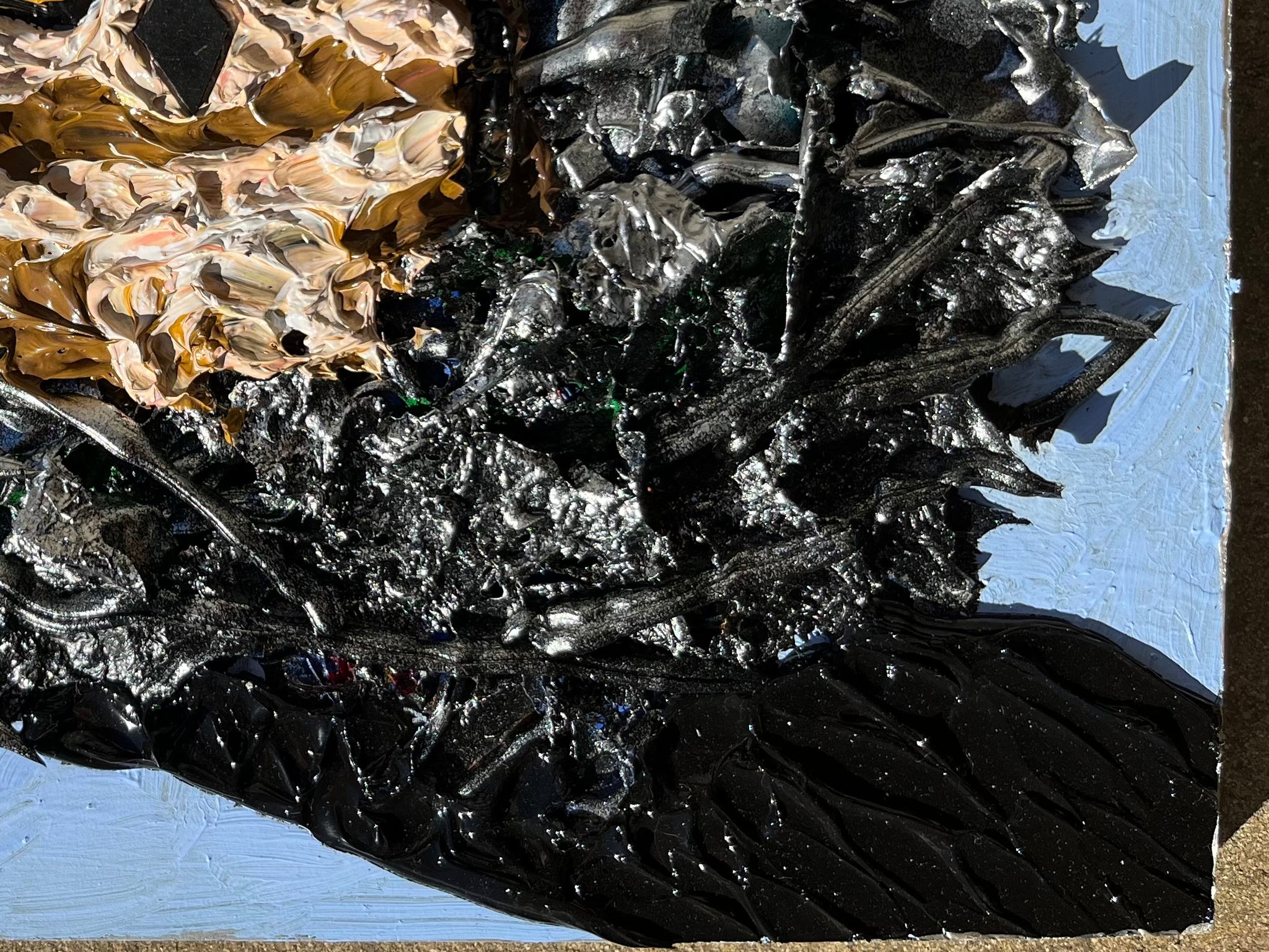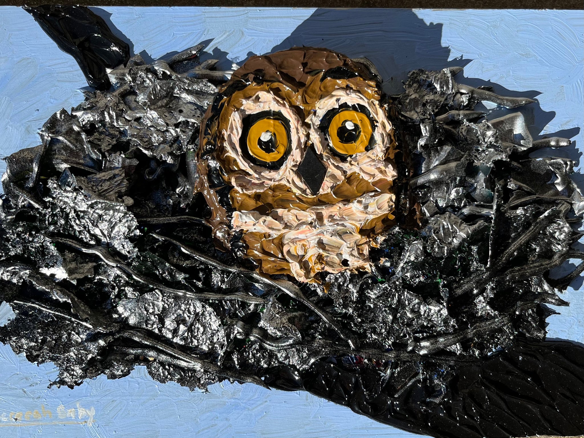 The extra big texture of this painting turns it into a wall hanging sculpture. The nest is scrumptious! Then the little screech owl baby- super cute.