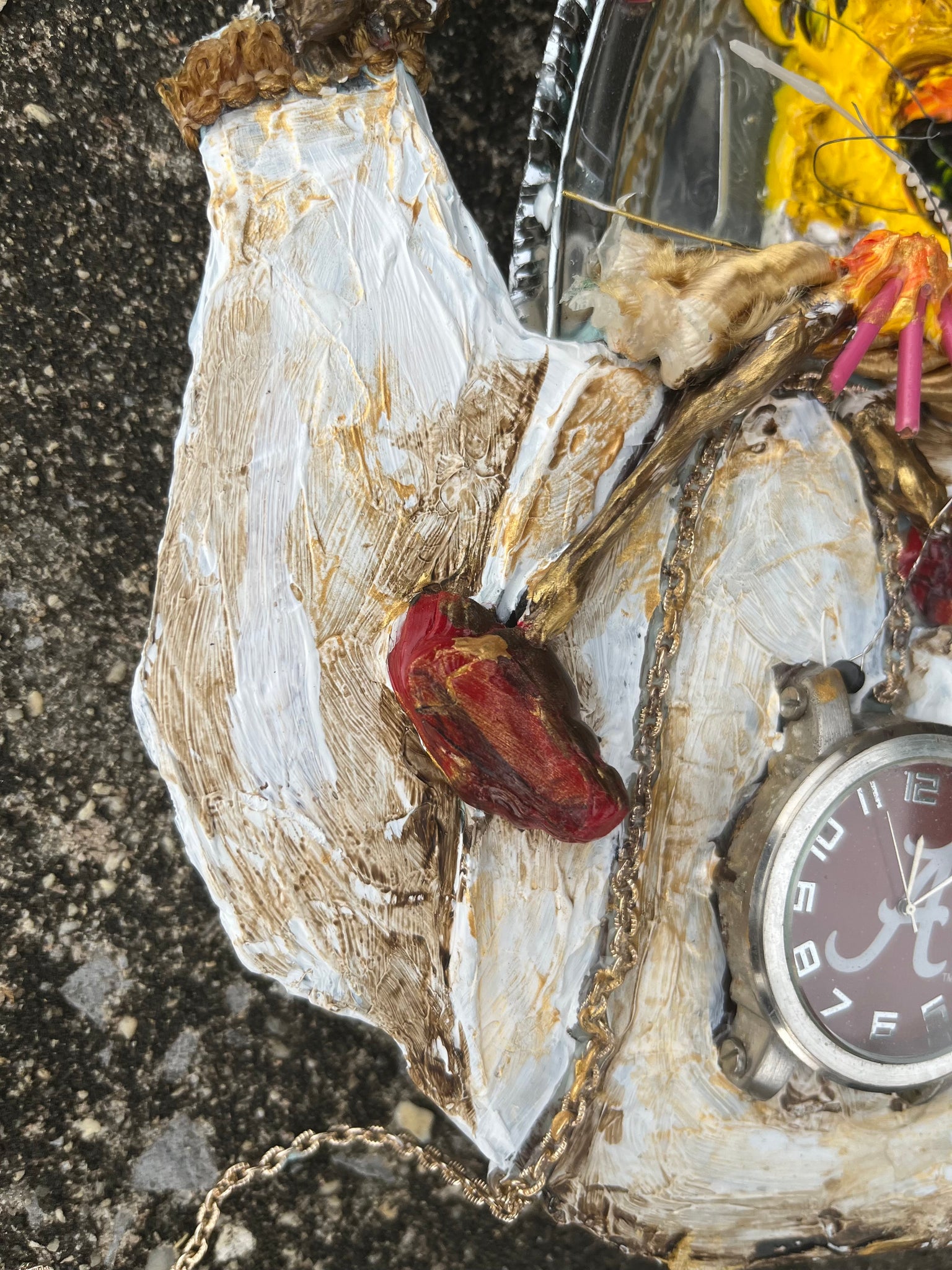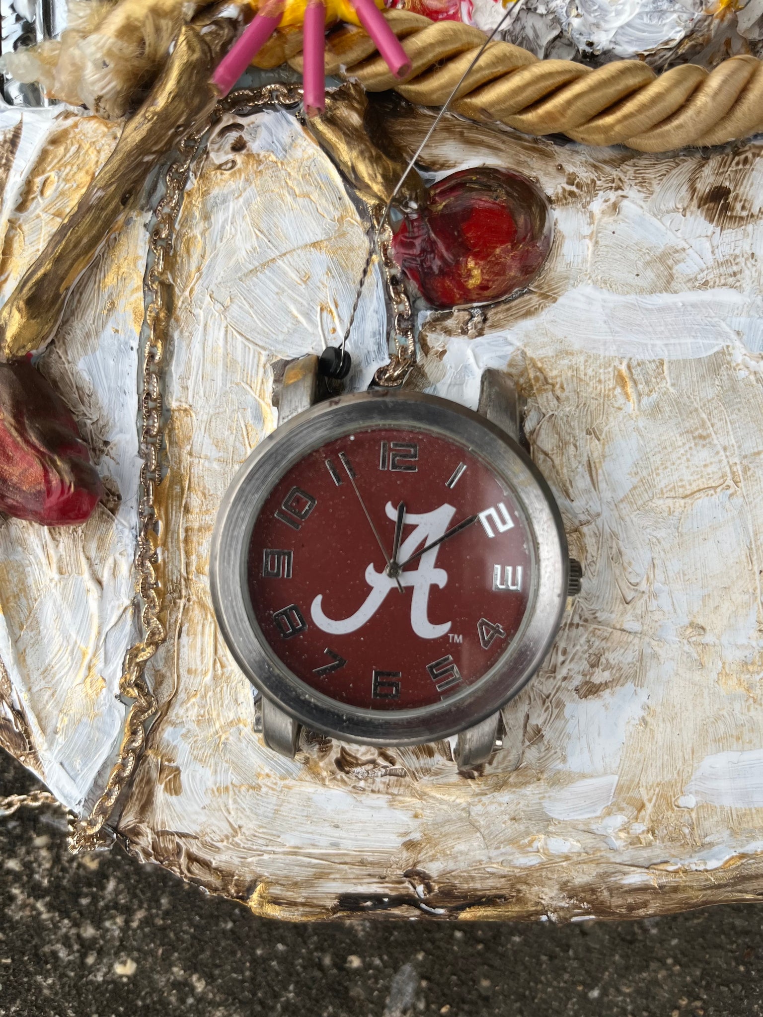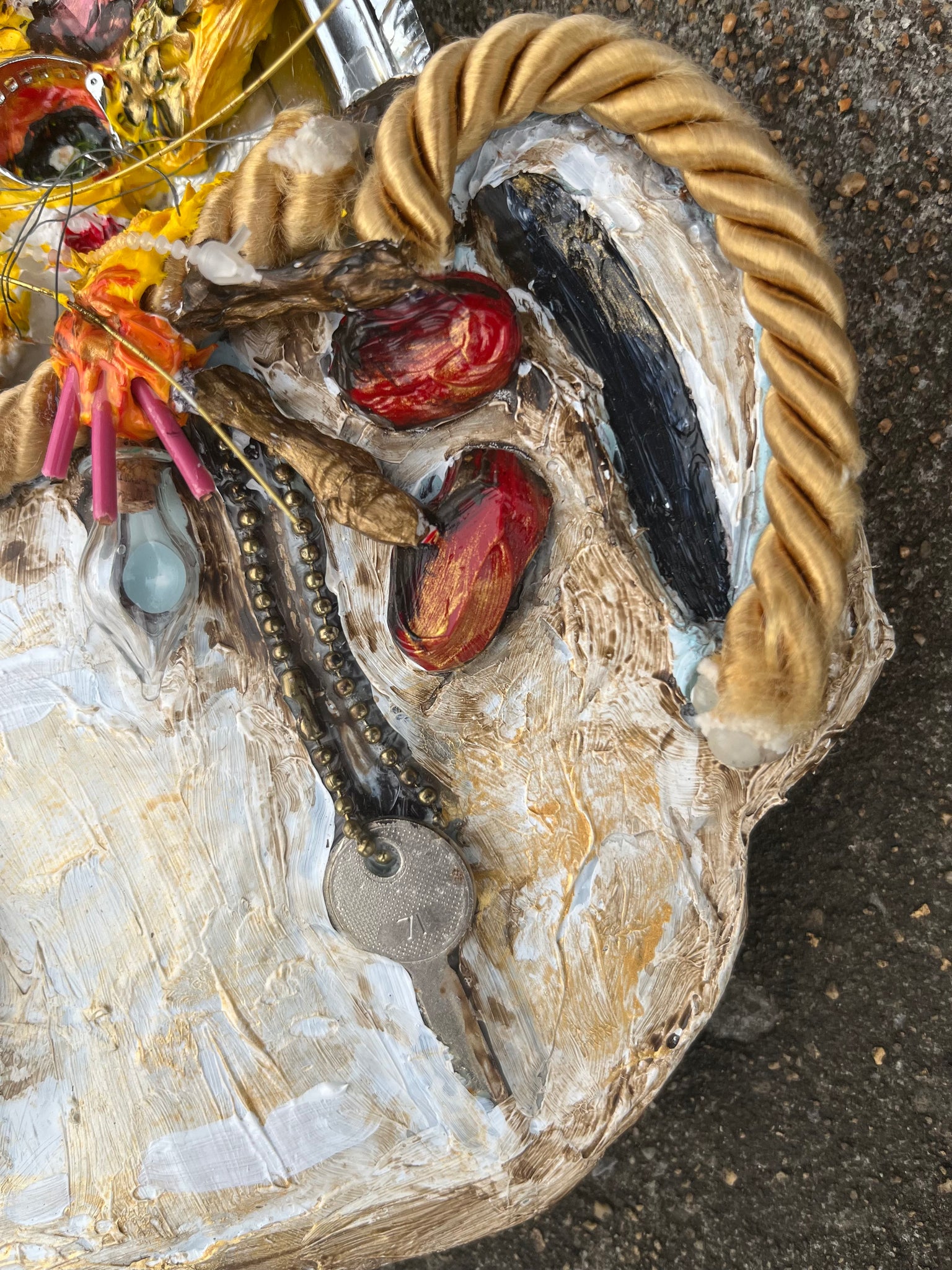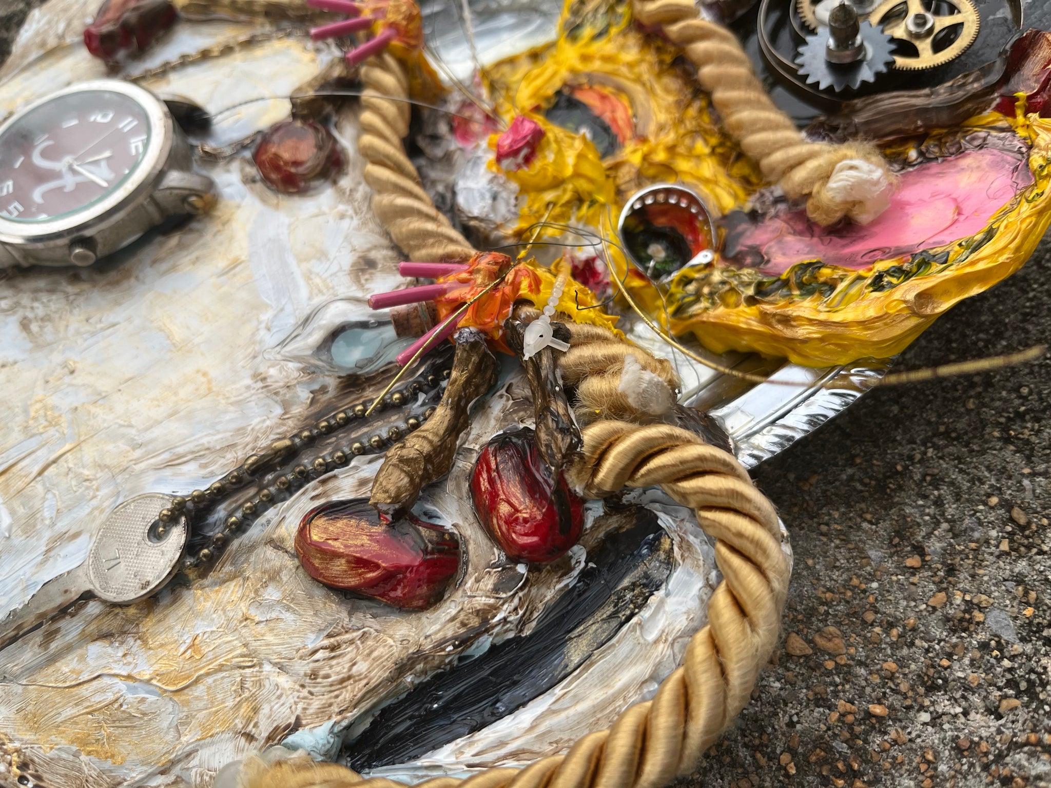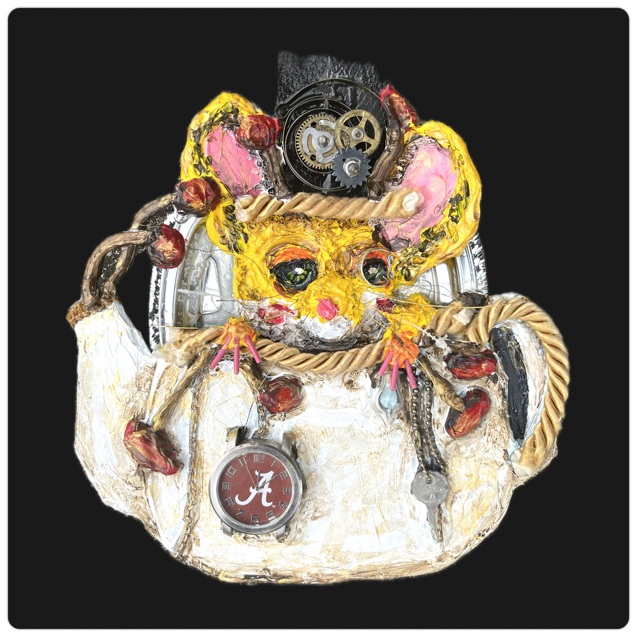 I was honored to be part of a group show at the Kentuck Art Gallery in Northport, Al. Kentuck invited 7 mixed media women artists to show their art together. I made 11 new Alice in Wonderland creatures for the show. Now that the show has ended, I’m posting what’s left of that of the Wonderland menagerie. Each of my Queen loyalist Wonderland characters in this series is on a red charger and has hearts on it somewhere. The Rebellion characters are on metal trays with mushrooms. I’m especially tickled with the little Dor Mouse in his teapot.